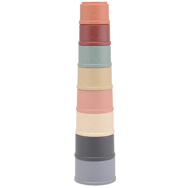 Babies and toddlers will discover endless fun with these sustainable bioplastic stacking cups. The set consists of 8 cups that can be stacked to form a tower up to 33.5 cm high. Thanks to the soft colors and eco-friendly material, this toy is not only educational and safe, but also a conscious choice for both parent and child. An added bonus: the cups have small holes, so children can also play with them in the bath or on the beach with water and sand.