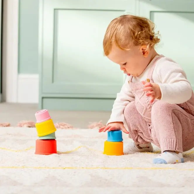 Deze zachte, veilige en kleurrijke stapelbekers van Tickit zijn ideaal voor baby’s en dreumesen die willen ontdekken, bouwen, stapelen en spelen. De bekers zijn gemaakt van food-grade silicone, voelen prettig aan in kleine handjes en zijn super veelzijdig: stapelen, in elkaar passen, vullen, overgieten, badspel, sensorisch spel… alles kan.
