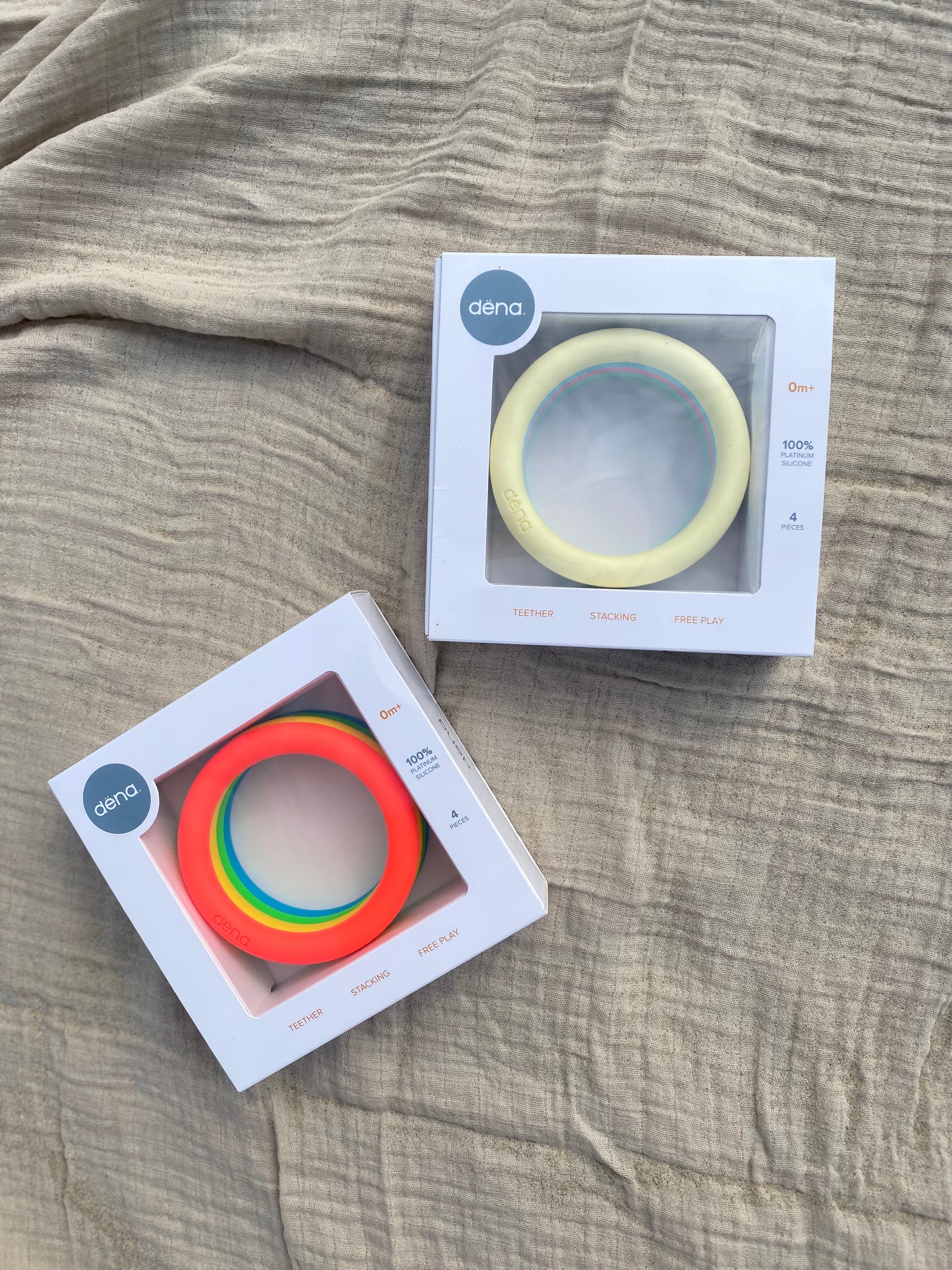 De dëna® bite & stack ringen zijn multifunctionele, zachte ringen die baby’s kunnen gebruiken om te sabbelen, te stapelen en mee te spelen. Gemaakt van 100% veilige platinum silicone zijn ze ideaal als bijtspeelgoed bij doorkomende tandjes én als open einde speelgoed om torens en vormen te bouwen. Dankzij de flexibele en duurzame kwaliteit gaan ze jarenlang mee en groeien ze mee met je kind.