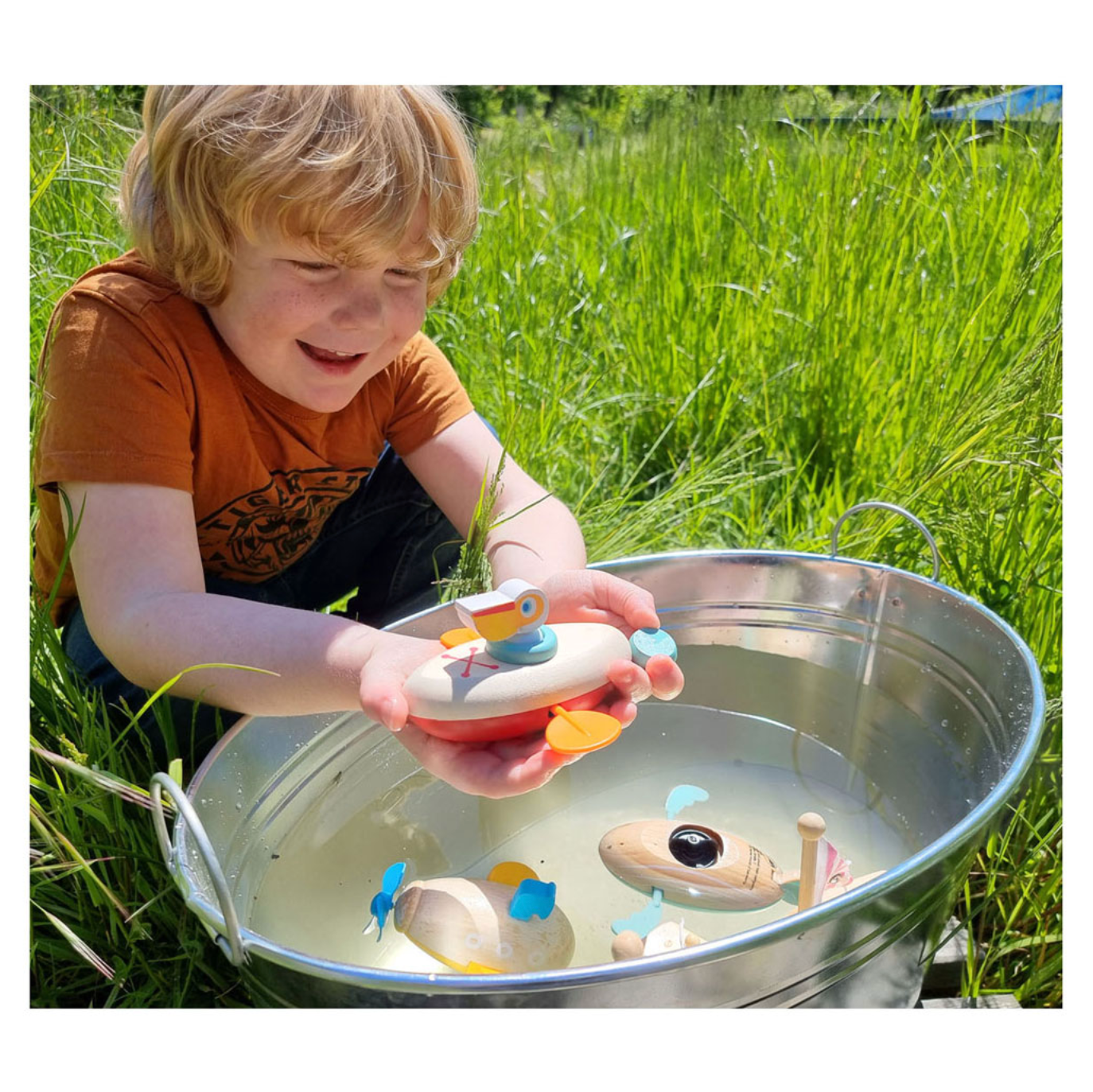 Door het gebruik van hout en een tijdloos ontwerp is dit een duurzaam alternatief voor veel plastic badspeelgoed.