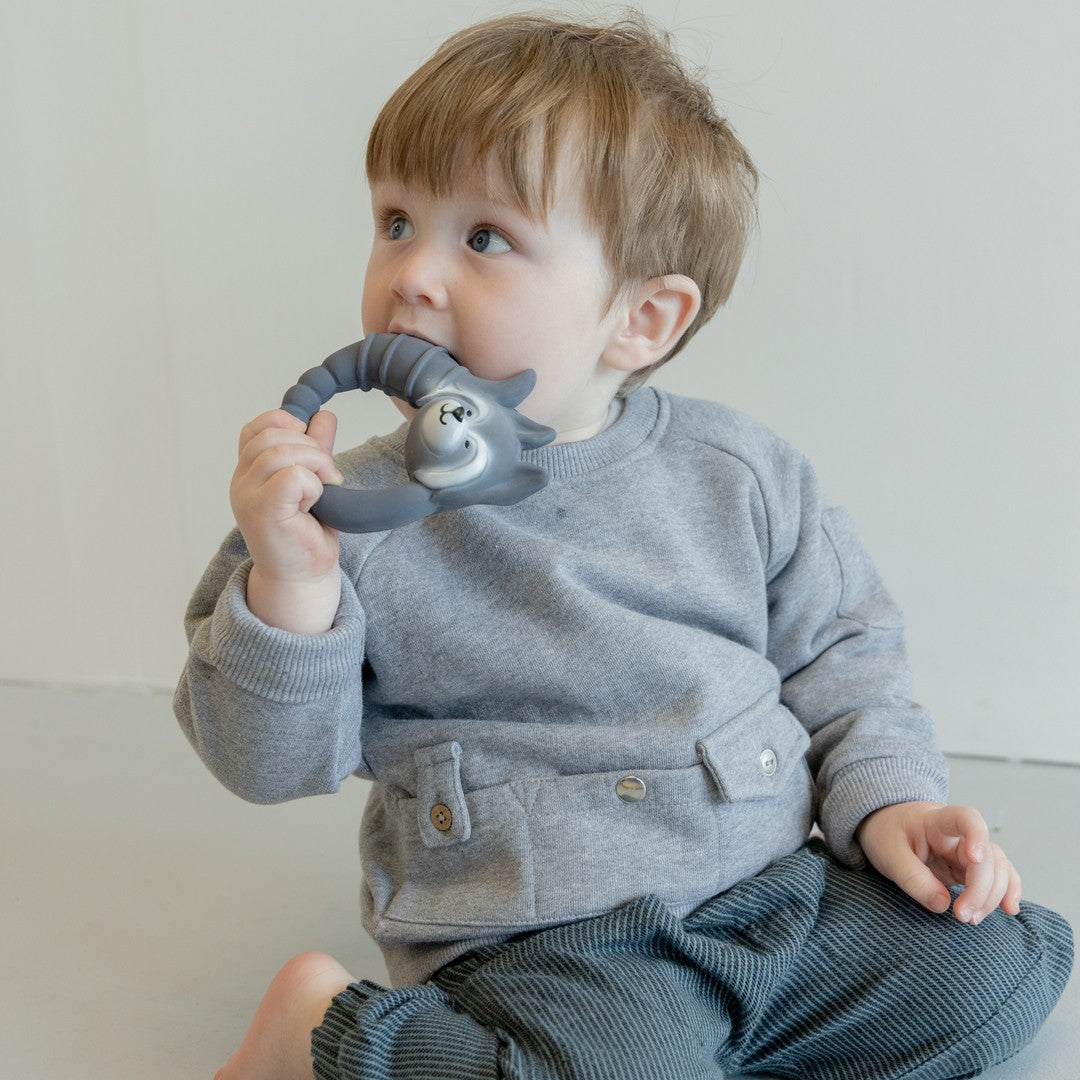 De wasbeer-bijtring stimuleert de zintuiglijke ontwikkeling en fijne motoriek van baby’s. Door te grijpen, voelen en kauwen oefenen ze hun handkracht, coördinatie en mondmotoriek. Het zachte natuurlijke rubber biedt verlichting bij pijnlijk tandvlees en ondersteunt ontspanning en zelfregulatie, precies wat baby’s nodig hebben tijdens het krijgen van tandjes.